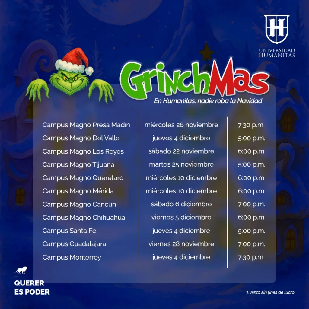 No dejes que este verde y burlón personaje se salga con la suya. En Universidad Humanitas, el aprendizaje y crecimiento van más allá de las aulas y con este evento navideño queremos comprobarlo. Qué mejor manera de compartir que una serie de actividades y amenidades diseñadas para fortalecer los lazos entre compañeros y docentes. Así, podrás relajarte, divertirte y juntos demostrarle al Grinch que el espíritu navideño de nuestra comunidad está a prueba de todo. ¡Ya es momento de empezar a coleccionar los mejores recuerdos de esta época!